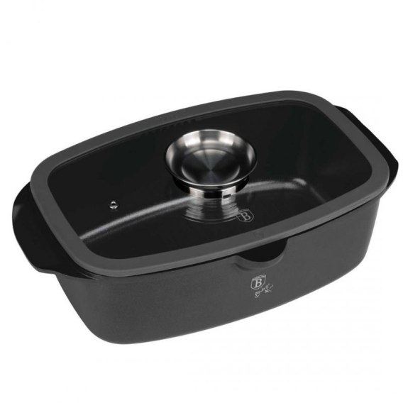 Cechuje się wytrzymałą konstrukcją, która niezawodnie opiera się wypaczeniom i dobrze nagrzewa się, zapewniając równomierną dystrybucję ciepła na całej powierzchni. Pokrywa ze szkła hartowanego zawierająca uchwyt z dozownikiem ze stali nierdzewnej (Arom Knob). Dzięki innowacyjnemu uchwytowi typu Aroma Knob można w wygodny sposób dozować do wnętrza brytfanny przyprawy lub oliwę np. smakową. Umożliwia wygodne dolewanie wody / oliwy lub wina w trakcie pieczenia i gotowania bez konieczności podnoszenia pokrywy co sprawia, że potrawy stają się jeszcze bardziej aromatyczne. Potrawa będzie dzięki temu soczysta i nie przypali się. Stanowi idealne uzupełnienie wielu innych elementów kolekcji Berlinger Haus Antracite Collection.