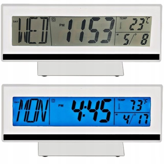 Duży podświetlany na niebiesko wyświetlacz zegara LCD z dużymi, czytelnymi cyframi, termometrem, alarmem oraz kalendarzem, wyświetla godzinę, datę, dzień, temperaturę w stopniach Celsjusza i Fahrenheita, alarm z opcją drzemki, osiem opcji dźwiękowych, wyświetlacze w siedmiu językach, minutnik, tryb czasu światowego i reakcję głosową