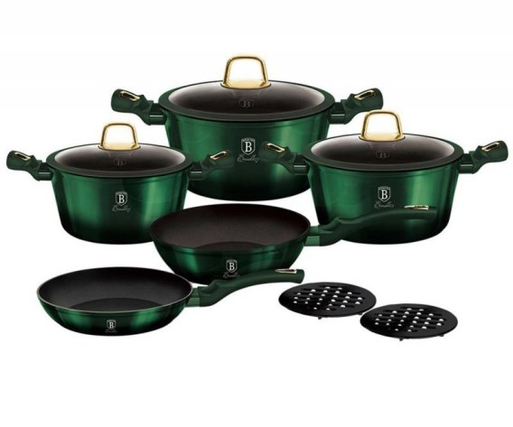 Garnki, patelnie i akcesoria z serii EMERALD METALLIC LINE firmy BERLINGE RHAUS wykonane są z wysokiej klasy kutego aluminium pokrytego wewnątrz powłoką tytanową o bardzo wysokim współczynniku twardości. Powłoka zewnętrzna w kolorze zielonym o charakterystycznym metalicznym połysku. Te atrakcyjne i modne naczynia wyposażone są standardowo w uchwyty typu SOFT TOUCH (silikon handle). Przystosowane do wszystkich rodzajów kuchenek: gazowa, elektryczna, ceramiczna, halogenowa, indukcyjna. System TURBO INDUCTION (bardzo szybko nagrzewają się) pozwala zaoszczędzić nawet 35% energii.