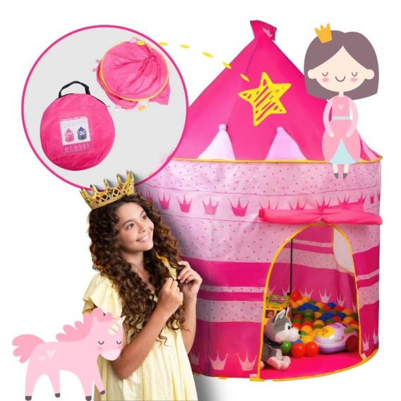Kolorowy namiot w kształcieczarodziejskiego zamku natychmiast przyciąga wzrok i wzbudza zainteresowanie dzieci. Idealny dlamałychksiężniczek, rycerzy i każdego malucha, który marzy o własnym królestwie.