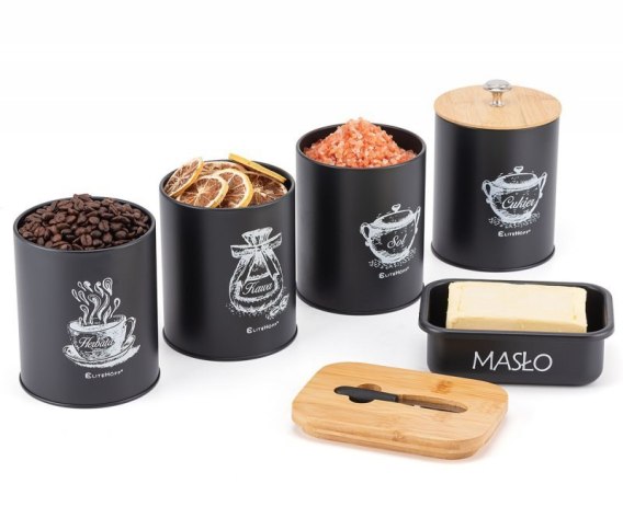 Pojemniki kuchenne zostały zaprojektowane tak, aby spełniać wszystkie potrzeby Twojej kuchni. Są odporne na uszkodzenia mechaniczne oraz łatwe do utrzymania w czystości.Wykonane z metalu malowanego proszkowo na kolor czarny. Pokrywy wykonane z drewna bambusowego. W pokrywie maselniczki nożyk do smarowania umieszczony w wyprofilowanym zagłębieniu.