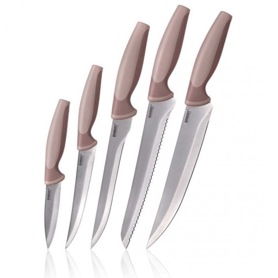 Każdy nóż posiada rękojeść z antypoślizgowego tworzywa, które zapewnia pewny chwyt oraz komfort użytkowania. Ergonomiczny kształt uchwytu minimalizuje zmęczenie dłoni, co jest szczególnie istotne podczas dłuższej pracy w kuchni.