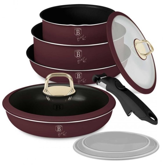 Najwyższej jakości zestaw garnków i patelni aluminiowych z potrójną powłoką tytanową TYTAN PRO oraz odpinaną rączką w systemie Click it. Produkt renomowanej marki BERLINGER HAUS z linii Leonardo Collection. Przystosowane do wszelkiego typu kuchenek, także indukcyjnych. Patelnie oraz garnki posiadają wygodne, odpinane, nienagrzewające się rączki. Dzięki temu łatwo je przechowywać, można wstawić do piekarnika a w zmywarce zajmą mniej miejsca niż tradycyjne. Naczynia posiadają precyzyjnie szlifowane, płaskie dna z dyskiem ferromagnetycznym. Wpływa to na równomierne ogrzewanie potraw oraz bardzo dobre magazynowanie ciepła. System odpinanych rączek ułatwia przechowywanie naczyń. Plastikowe pokrywy w zestawie pozwalają szczelnie przykryć naczynia gdy chcemy potrawy przechowywać w lodówce.